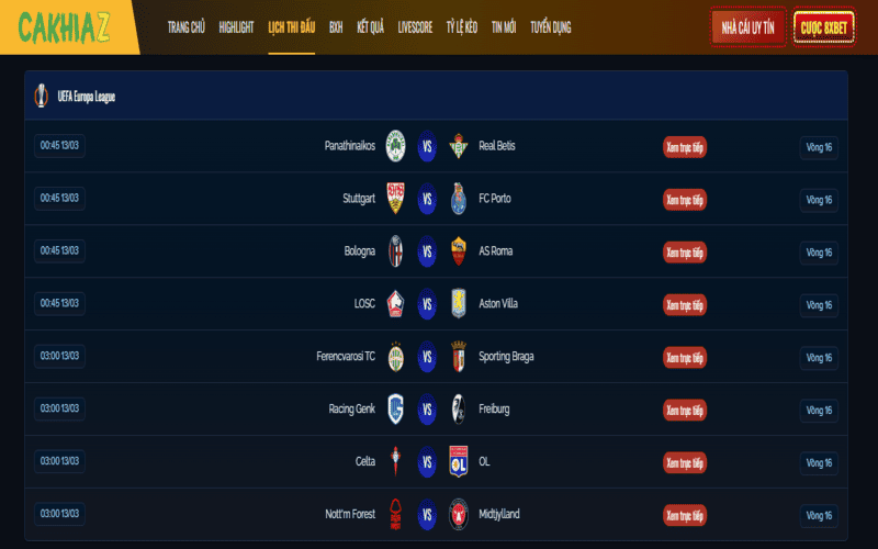 Chuyển hướng nhanh từ lịch thi đấu đến trận cầu trực tiếp